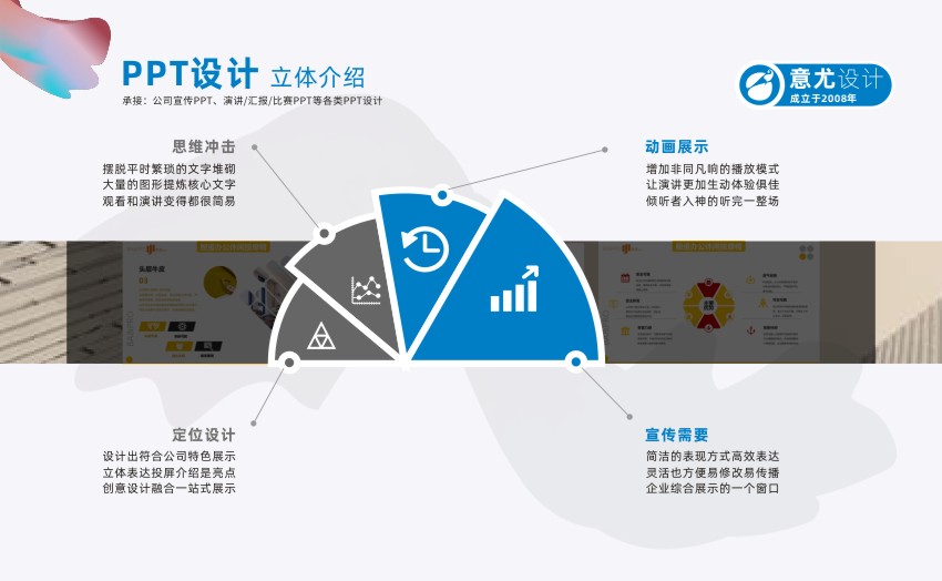 蘇州意尤文化傳播有限公司是一家有著多年廣告設(shè)計(jì)經(jīng)驗(yàn)的蘇州知名廣告企業(yè) 主要業(yè)務(wù)有蘇州PPT設(shè)計(jì)、蘇州產(chǎn)品PPT設(shè)計(jì)、蘇州企業(yè)PPT設(shè)計(jì)、蘇州會(huì)議PPT設(shè)計(jì)、蘇州項(xiàng)目PPT設(shè)計(jì)、企業(yè)VI設(shè)計(jì)、設(shè)計(jì)印刷宣傳冊(cè)/樣本/單頁/名片等 自2007年成立以來,蘇州意尤廣告公司與蘇州及蘇州各市的幾百家中外企業(yè)進(jìn)行了廣告設(shè)計(jì)合作,經(jīng)過多年發(fā)展公司已形成了以企業(yè)PPT設(shè)計(jì)、企業(yè)VI設(shè)計(jì),廣告設(shè)計(jì),廣告印刷,樣本設(shè)計(jì),宣傳冊(cè)設(shè)計(jì),名片印刷,菜譜制作,單頁,宣傳單等一批特長(zhǎng)業(yè)務(wù),相信在各位新老客戶的關(guān)心下,本公司會(huì)得到更大的發(fā)展,同時(shí)為客戶的發(fā)展宣傳保駕護(hù)航。